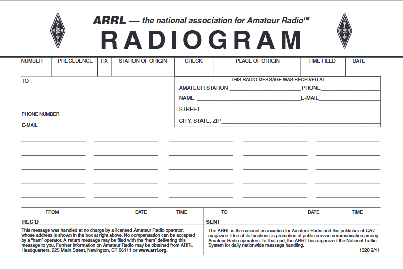 Local Amateur Radio operators participate in the National Traffic System sending messages across the United States and Canada. Learn more about the National Traffic System at the ARRL’s NTS Webpage and at NTS 2.0 website.